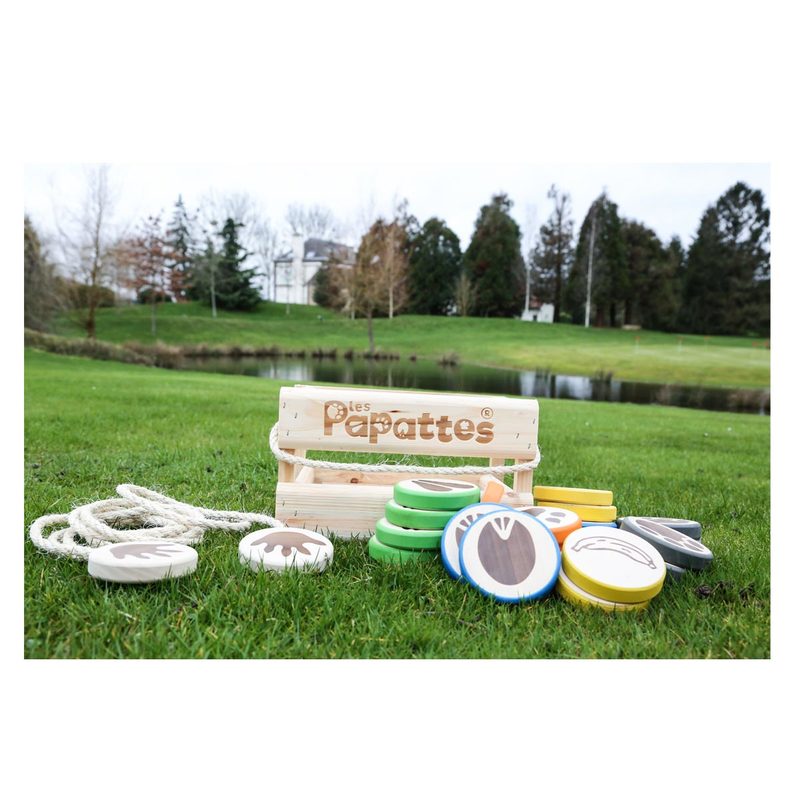 Est un jeu de palets en bois qui invite deux à quatre joueurs à jouer en extérieur, dans un jardin, un parc ou sur la plage. Chaque joueur choisit un animal qu’il devra mener à la rivière, représentée par un fil tendu à sept mètres de la zone de lancer. Chacun leur tour, les joueurs lancent une papatte (palet) le plus proche possible de la rivière en prenant garde à ne pas dépasser la rivière car les crocodiles rodent juste derrière ! Le parcours est semé d’embûches car les croche-papattes, les glissades sur peaux de bananes et les papattes cassées compliquent la partie. Au jeu des papattes, petits et grands jouent à armes égales pour tenter de marquer un total de 25 points. Une bonne occasion de développer sa dextérité en s’amusant !